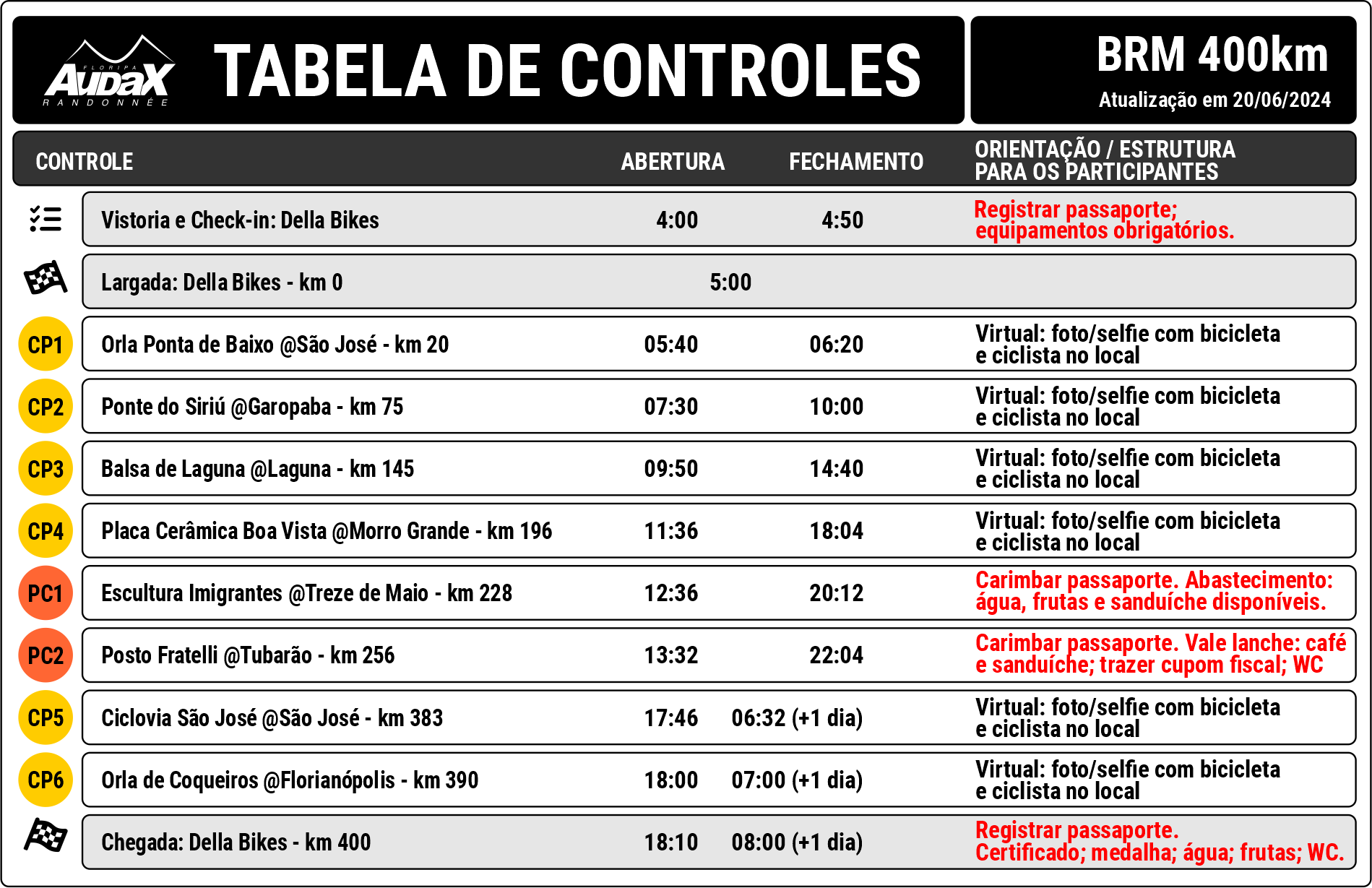 A programação do Audax Floripa BRM 400km será realizada na Della Bikes (Rua Juvêncio Costa, 269 – Trindade – Florianópolis) – confira em detalhes: